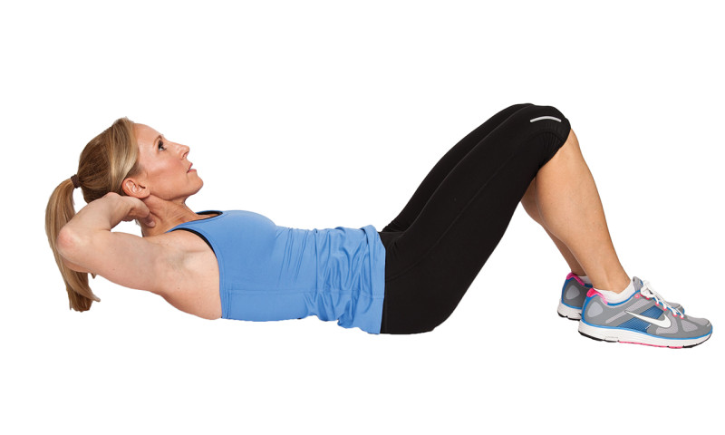 Исходное положение лежа на спине. Согните ноги в коленях, стопы плотно прижмите к полу. Руки заведите за голову. На выдохе отрывайте корпус от пола, на вдохе опускайтесь, повторите 3 подхода по 10 раз.