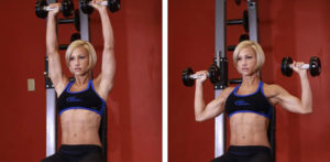 Чтобы выполнить упражнение, сядьте на скамью, надежно прижав лопатки к ее спинке. Чуть прогнитесь в пояснице. Возьмите гантели в руки. Исходное положение – руки согнуты, локти «смотрят» вниз, гантели расположены на уровне плеч, ладонь направлена вперед. На выдохе выжмите гантели вверх, стараясь не распрямлять локти до конца, а оставлять небольшой угол. На вдохе вернитесь в исходное положение.