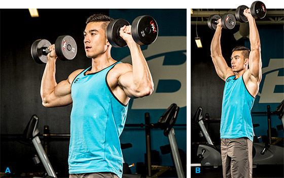 - Без паузы переходите к сету из 10 жимов над головой сидя или стоя. Да, это смехотворный рабочий вес для жима, но после трех других упражнений нагрузка покажется вам нешуточной. Используйте широкую стойку, чтобы было проще удерживать равновесие, и завершайте каждое движение максимальным сведением гантелей, но без соударения в верхней точке.