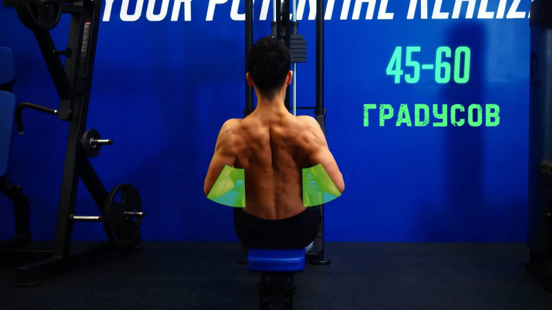 Следующая — тяга нижнего блоке. Во время выполнения не прижимайте локти к торсу, держа их под углом примерно 45-60 градусов. Кроме того, не следует поднимать плечи, а также следить за тем, чтобы при тяге лопатки сводились вместе. Если хватает сил, угол можно увеличить, что сделает упражнение более эффективным.