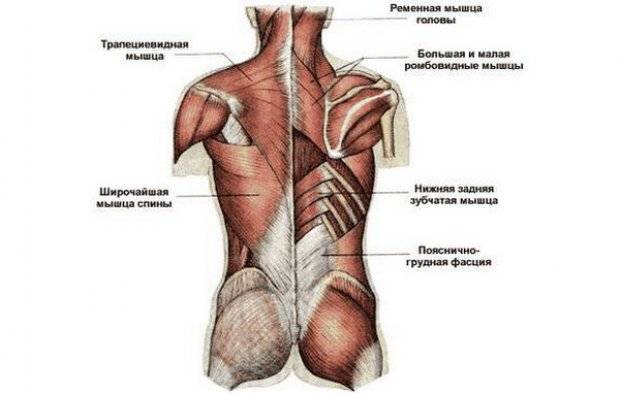 | Трапециевидные мышцы, находящиеся на шее и проходящие по всему грудному отделу | Большая круглая мышца, находящаяся около подмышки | Группа мышц, выпрямляющих позвоночник (вдоль всего позвоночника) |