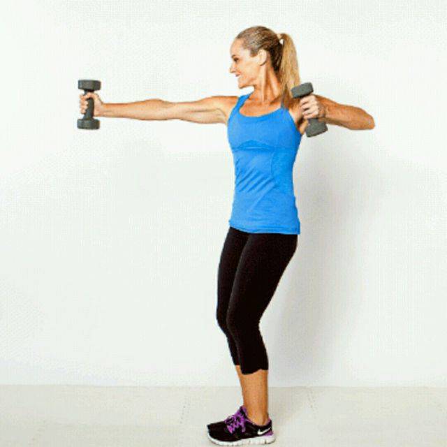 - Поднимите обе руки в стороны. Постарайтесь соединить лопатки вместе, сохраняя при этом небольшой изгиб локтей. Остановитесь, когда ваши руки окажутся на уровне плеч. Задержитесь на 2 секунды.