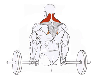 - Выполнение упражнения начинается с подъёма плеч на максимально возможную высоту. Движение штанги контролируется исключительно «трапециями», никакие другие системы мышечных тканей в упражнении не прорабатываются.