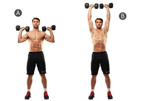 Техника выполнения: встаньте ровно, и согнув руки в локтях, расположите гантели перед собой. На выдох, разворачивая кисти, поднимите гантели над головой, сводя их в верхней точке. На вдох, вернитесь в исходное положение.
