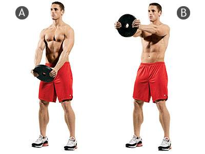 В этом упражнении можно использовать как штангу, так и гантели, но есть еще один вариант. Встаньте прямо, возьмите блин в руки (А), теперь поднимайте руки вверх (В). Поднимайте руки чуть выше параллели с полом, это позволит вам держать в напряжение передние дельты на протяжении всего упражнения. Это изолированное упражнение, поэтому делаем 5 подходов по 15 повторений.