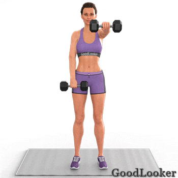 Поставьте ноги на ширине плеч, возьмите гантели прямым хватом и опустите руки на бедра. Держите руки слегка согнутыми в локтях, чтобы обезопасить суставы. Поднимите правую руку вверх перед собой до параллели с полом. Опустите и поднимите левую, двигаясь осознанно. Поднимайте руки от плеч, а не с помощью бицепсов. Эффективное силовое упражнение на плечи прорабатывает передние пучки дельт, ответственные за фронтальный рельеф плеч.