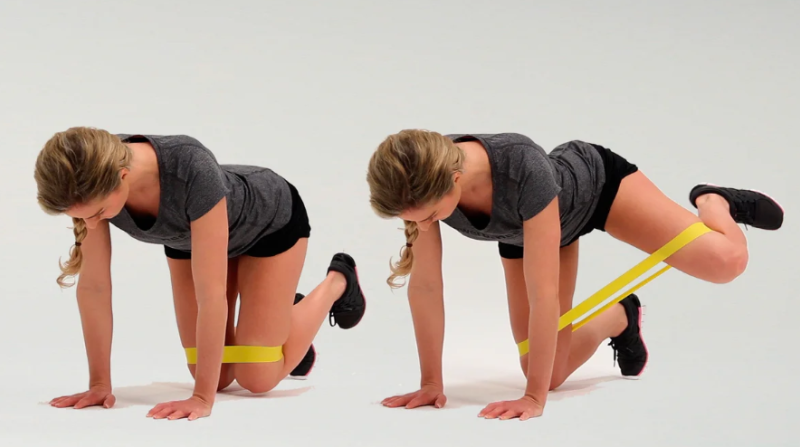 Такие упражнения с резинками обеспечивают проработку ягодичных мышц, а также задней поверхности бедер. Исходной положение тела и инвентаря идентичны, как и в предыдущем описании. Необходимо поочередно делать махи согнутыми в коленке ногами так, чтобы остался виртуальный отпечаток ноги спортсмена на потолке. В верхней позиции также потребуется задержать ногу на 2-5 секунд, после чего вернитесь в первоначальное положение.