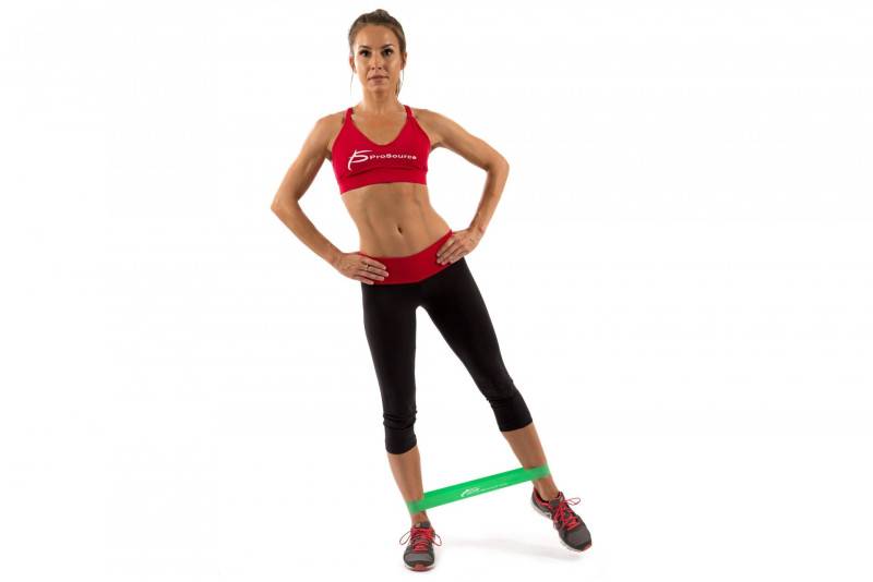 - Надеть резинку, поместить ее чуть выше коленей, стопы поставить на ширине плеч.