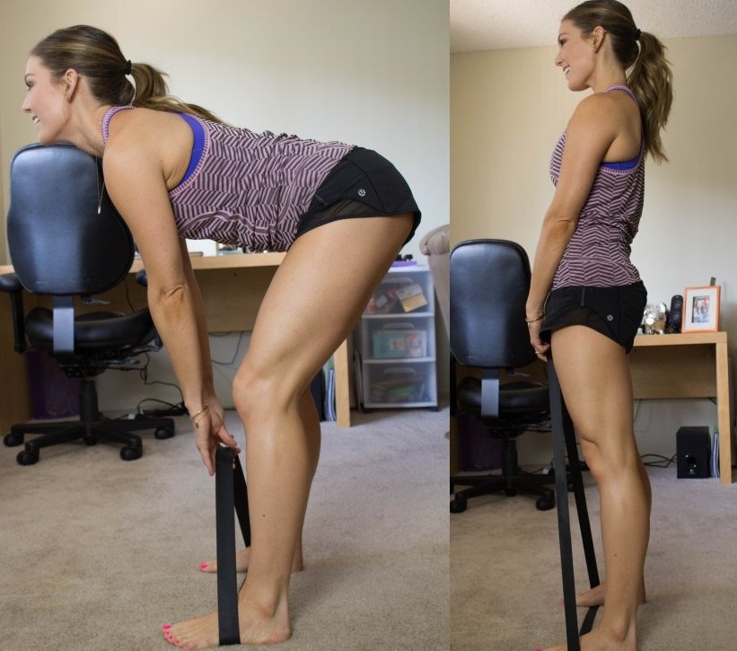 - По очереди поднимаем каждую ногу, растягивая эластичный снаряд