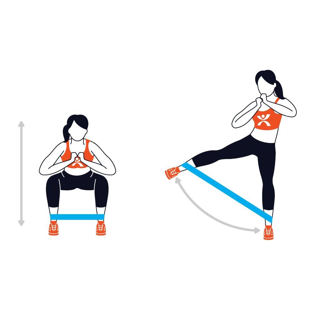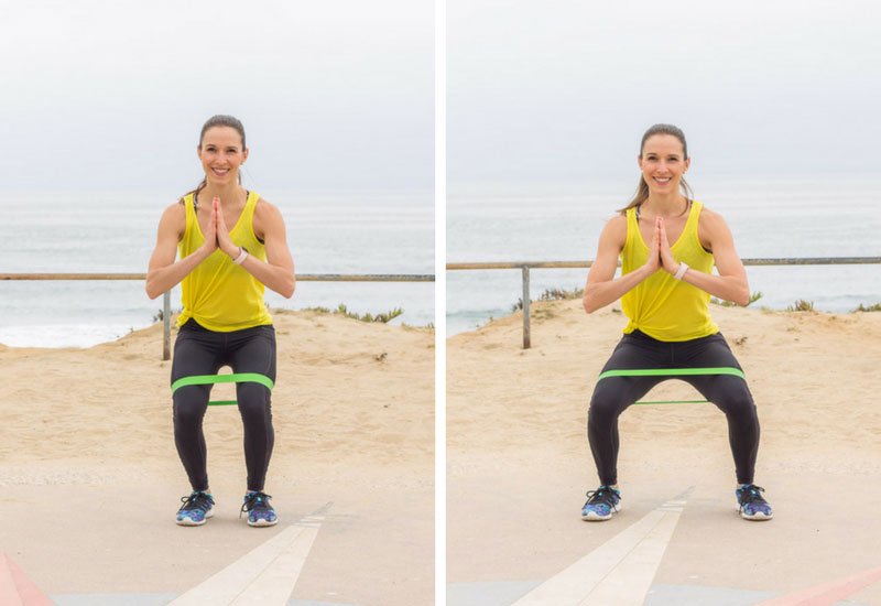 Фитнес-резинка должна располагаться на бедрах над коленом. Разместите ступни на ширину Ваших плеч, а руки положите на бедра или сомкните в ключ напротив грудной клетки. Выполните глубокое приседание, для этого необходимо согнуть ножки в коленях, а ягодицы отвести назад. Восстановите свое первоначальное положение, и затем сразу же отведите в сторону одну ногу. Контролируйте, чтобы колено держалось прямо, не направлялось внутрь или наверх. Продублируйте приседание и отведение в сторону другой ноги.