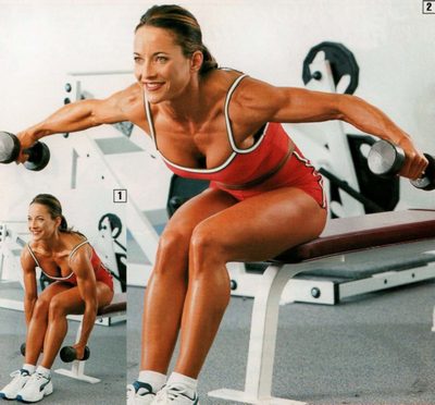 Лучше всего чувствуется в этом упражнении задний пучок дельтовидной мышцы. Чтобы выполнить его, возьмите в руки гантели, наклоните корпус вперед (примерно до параллели с полом) и слегка прогните спину в пояснице. Для более стабильного положения можете упереться лбом в скамью или другую удобную опору. На выдохе поднимайте руки через стороны до параллели с полом. Локти должны быть самую малость согнуты и устремлены вверх. Опускайте руки медленно и плавно.