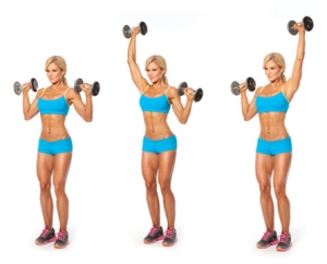 Чтобы выполнить упражнение, сядьте на скамью, надежно прижав лопатки к ее спинке. Чуть прогнитесь в пояснице. Возьмите гантели в руки. Исходное положение – руки согнуты, локти «смотрят» вниз, гантели расположены на уровне плеч, ладонь направлена вперед. На выдохе выжмите гантели вверх, стараясь не распрямлять локти до конца, а оставлять небольшой угол. На вдохе вернитесь в исходное положение.