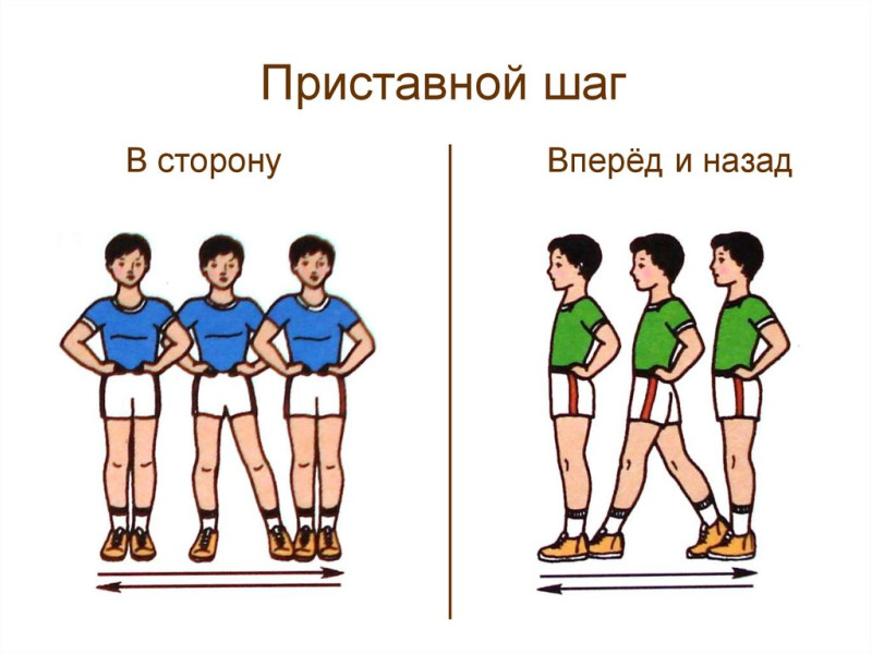 - Приставной шаг с руками Делаем то же самое, что и в предыдущем упражнении, только руки не поясе, а из сторон переводится вверх.