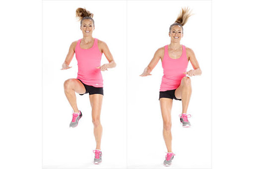 Начинаем шагать медленно и плавно переходим на легкий бег на месте поднимая вверх колени.