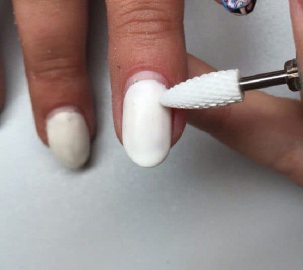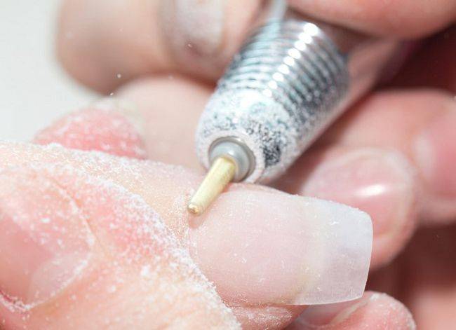 После этого нужно приступить к спиливанию финишного покрытия, представляющего собой верхний блестящий слой средства. Мастера наносят это вещество для закрепления акрила. Его необходимо удалить, чтобы приступить к растворению акрилового слоя. Финиш спиливают не спеша. Без данного покрытия ногтевая поверхность будет выглядеть шершавой.