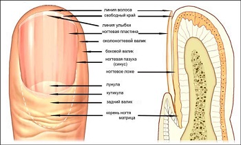 - Ногтевое ложе – это полностью закрытый пластиной, которую в обиходе называют «ноготь», слой эпидермиса. Испещрено кровеносными сосудами и нервными окончаниями. Пластина крепится к ложу соединительной тканью – эпителием.