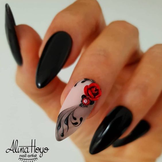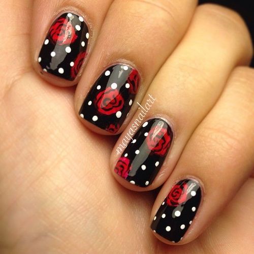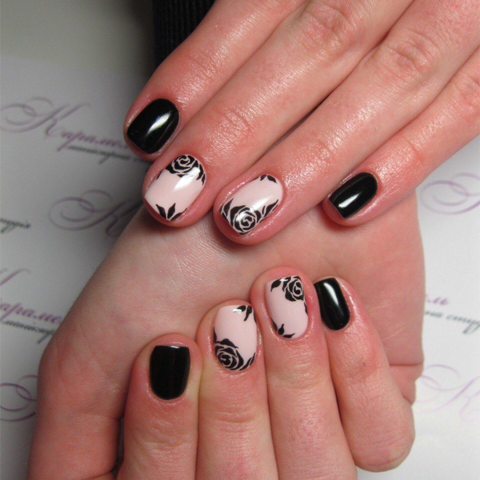 Не каждая девушка предпочитает для выполнения маникюра черный цвет, поскольку такой цвет подходит решительным и роковым дамам, которые привыкли действовать неординарными способами. Выбор такого оформления маникюра подходит как на каждый день, так и для вечеринок. Для выполнения маникюра с черным оттенком существует множество вариантов: комбинирование и смешивание с другими оттенками, а также различными росписями. Царица цветов – роза часто выполняется белым цветом, таким образом идеально подчеркивается элегантность и уверенность девушки. Для выполнения такой идеи не нужно расписывать все ноготки, достаточно одного (обычно это безымянный пальчик). Если цветочный орнамент дополнить матовым покрытием, то особая оригинальность нейл-арту обеспечена. Все зависит от желания и индивидуальности девушки.