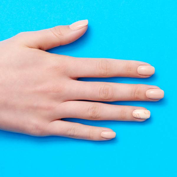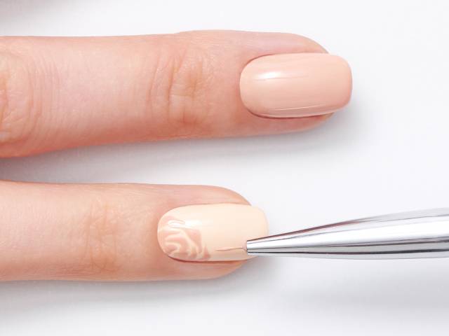Возьмите основной цвет (мы выбрали персиково-бежевый) и покройте им все ногти, кроме того, на котором будет рисунок. Светлые лаки довольно капризны в нанесении: могут лечь не очень ровно, оставляя пробелы и полосы. Чтобы избежать этого, нанесите лак в два слоя, дожидаясь полного высыхания каждого.