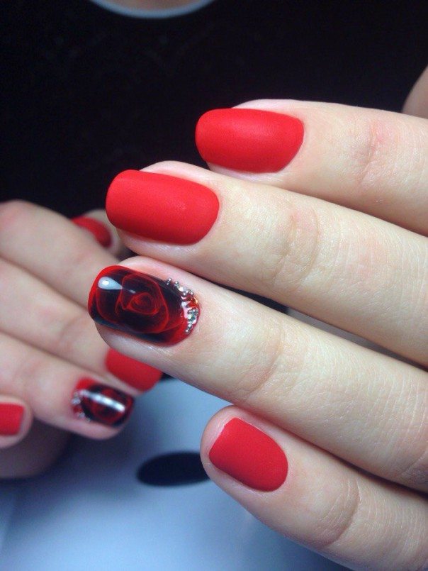 Розы на ноготках довольно популярный маникюр. Исходя из этого, имеется большое разнообразие выполнения таких картинок. Начиная от нежных постельных тонов, заканчивая контрастными, яркими нейл-артами. Вы можете поиграть с различными красными оттенками. Такой маникюр будет смотреться изысканным и придаст вам необыкновенный шарм. Более светлый оттенок красного подойдет для основы, а рисунок делайте насыщенным темным оттенком.