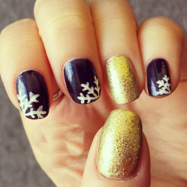 Дизайн со снежинками достаточно универсален. Несмотря на то, что этот маникюр считается зимним, его можно использовать в любое время года. Еще одно преимущество – применяются разные цвета гель-лака. Вы можете нарисовать красные снежинки или использовать для этого классический белый или синий цвет. Красиво смотрятся декоративные элементы, выполненные золотистым гель-лаком.