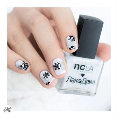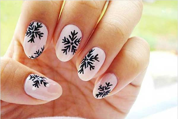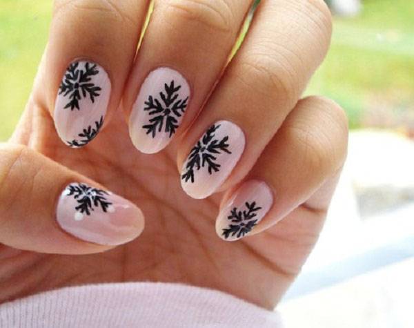 Такой маникюр смотрится стильно, но не совсем по-новогоднему. Зато такой дизайн подойдет для светского мероприятия. Если вы идете на праздник в светлом платье, то синие ногти будут смотреться не очень уместно. Как нарисовать на ногтях снежинки? Этот маникюр сделать не очень просто, но при должном старании у вас все получится. Начать нужно с обработки ногтевой пластины. Следует ее запилить бафом и нанести базу. Благодаря этому ноготь будет выровнен и лак распределится равномерно. Теперь наносим основной цвет. Это может быть что-то нежно-розовое или бежевое. Теперь можно переходить к рисунку. Берем тонкую кисть и обмакиваем ее в черный лак. Ставим точку – это будет центр снежинки. Теперь с каждой стороны нужно нарисовать по галке. Ее острый угол должен быть направлен в центр. Затем нужно дорисовать на той же линии еще одну галку. Заканчиваем луч снежинки небольшой палочкой, на которую нанизываем ранее нанесенные галки.