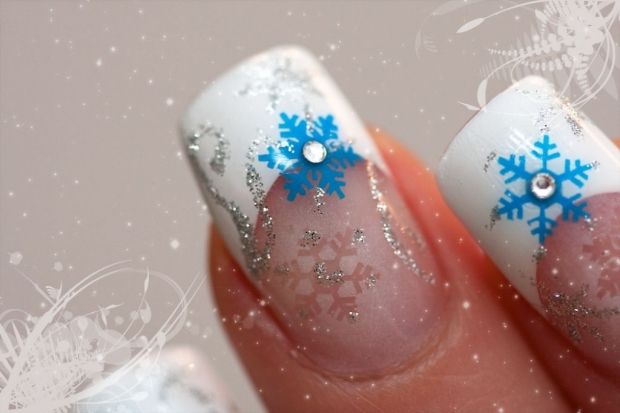 Чтобы маникюр выглядел еще более эффектно, можно в середину каждой нарисованной снежинки наклеить по маленькому стразу.