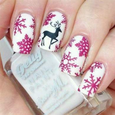 Этот маникюр интересный и нетривиальный. Тут есть все: стразы, рисунки и матовая поверхность. Как нарисовать снежинку на ногтях гель-лаком, можно прочесть выше. Для начала следует обработать ногти. Запиливаем их бафом и обезжириваем. Теперь следует нанести базу. Покрываем ногти в два слоя цветом и просушиваем их в лампе. Теперь следует взять тонкую кисть и приступить к рисованию. На одном ногте изображаем силуэт головы оленя, на другом – геометрический орнамент, а на третьем – снежинку. Теперь следует покрыть все ногти матовым топом и еще раз просушить. Чтобы дизайн смотрелся ярче и богаче, следует приклеить стразы. Прикрепляем их на ногти без дизайна с помощью капелек финиша. Блестящие камушки можно поместить в центр снежинок и некоторых частей орнамента. Просушиваем ногти и еще раз укрепляем каждую стразу топом.