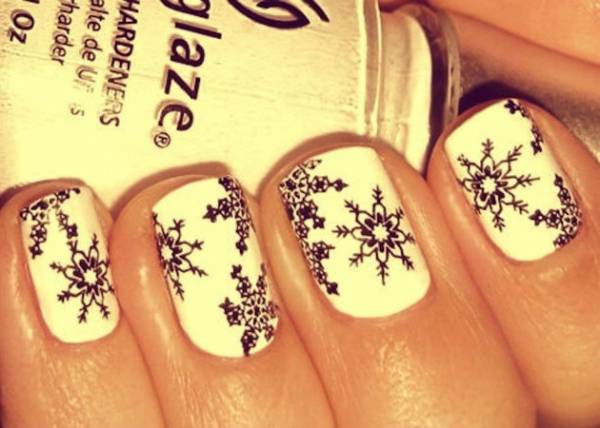 Думаете о том, как нарисовать на ногтях снежинку? Это несложно. Вам понадобится тонкая кисть, белый лак и много терпения. Зачем же терпение, если рисунок такой простой? А вы попробуйте нарисовать ровный круг от руки. Ну как, не получается? А ведь форма наипростейшая. Так и со снежинкой. Тренируйтесь, а идеи дизайнов вы сможете найти ниже.