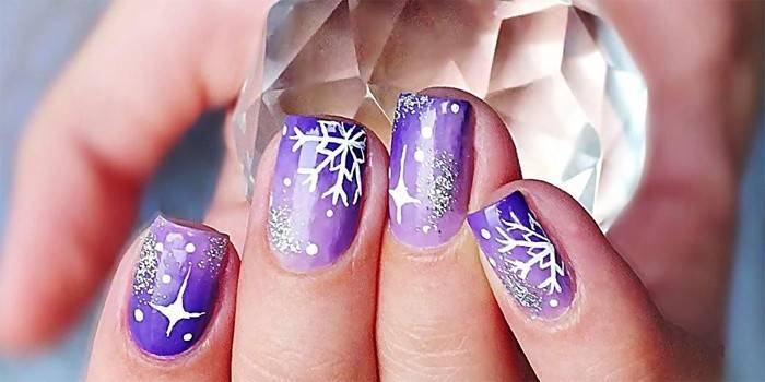 Необычно смотрятся снежинки, нарисованные на маникюре в технике градиента. Лучше использовать классические цвета для растушевки. Например, белый и синий. А декоративный элемент нарисуйте серебристым гель-лаком.