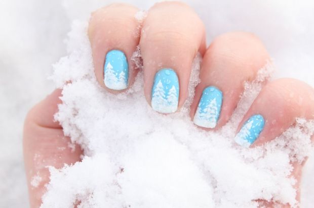 Чтобы добиться зимнего ледяного эффекта, который великолепно подходит в зимнее время года, следует использовать холодные цвета лаков. В маникюре допускается применение блёсток и перехода цветов, выполнение которых, делается при помощи аэрографа.