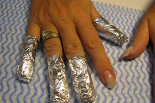Как только верхний слой удален, на ноготь укладывается тампон, тщательно смоченный в жидкости для снятия лака. Чтобы предотвратить испарение ацетона, кончики пальцев с ватными дисками плотно заматываются в фольгу. В этом случае фольгу можно назвать своеобразным одеялом для ногтей. Обмотав каждый ноготь, средство оставляется на 45 минут. Как правило, этого времени достаточно для полного растворения акрила.