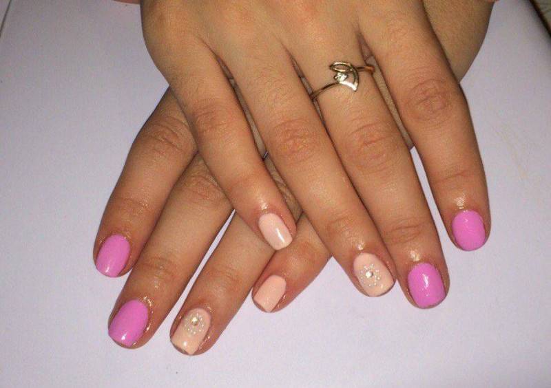 - На обезжиренную ногтевую пластинку наносится база под лак. После полного высыхания, наносится слой основного цвета. Для создания этого вида маникюра используют пастельные тона (розовый, кремовый, бежевый, персиковый).