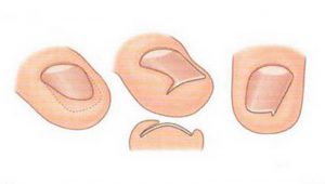 Полное удаление ногтевой пластины не даёт гарантию на избавление от проблемы: чаще всего новый ноготь вновь врастает в мягкие ткани пальца. Поэтому специалисты используют методы резекции – частичного удаления ногтя в проблемном месте с соответствующей ему частью ростковой области. После чего новая ногтевая пластина при отрастании становится более узкой и перестаёт врастать в палец.
