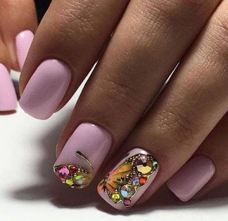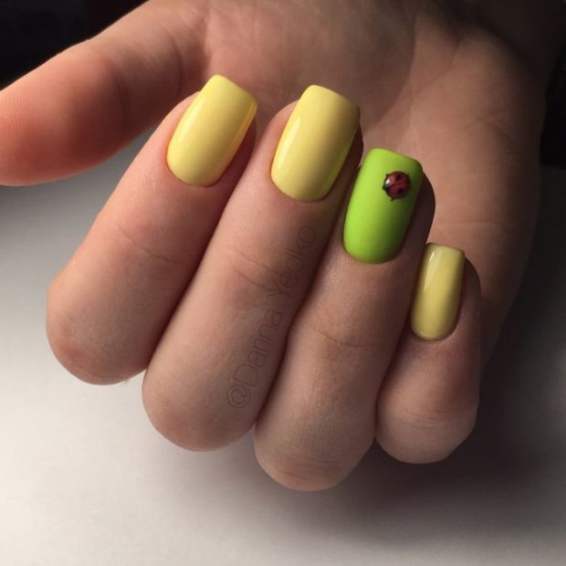 - Насекомые. Среди ос, стрекоз и «божьих коровок», бабочки бесспорно одержали пальму первенства. Они будут встречаться в самых разнообразных оттенках на фоне желтого. Высшим пилотажем считается нейл с изображением объектов в технике 3D.