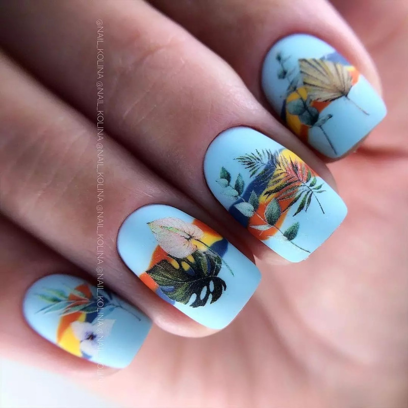 Ногти украшаются как минималистической росписью, так и яркими слайдер-наклейками. Цветовая гамма при этом радует своей пестротой и насыщенными оттенками. Фон основного покрытия должен быть светлым – белым, кремовым, нежно-голубым. А чтобы нейл-дизайн получился ещё эффектнее, можно «разбавлять» флористический принт однотонным лаком контрастного цвета.