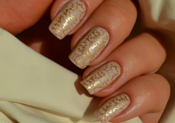 Для дизайна можно использовать лак с мелким глиттером. Другой вариант – создание ажурных рисунков с помощью переводной фольги. На пластинку наносят линии прозрачным лаком, затем прижимают к основе фольгу. На ногтях остаются нежные золотистые (или серебристые) узоры.