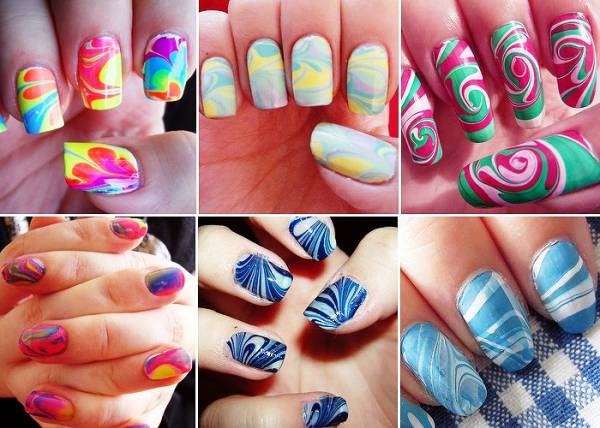 Непростая техника водного маникюра – одна из самых ярких изобретений мастеров нейл-арта. Сначала узоры формируются на поверхности воды, а потом «оседают» на пластинках.