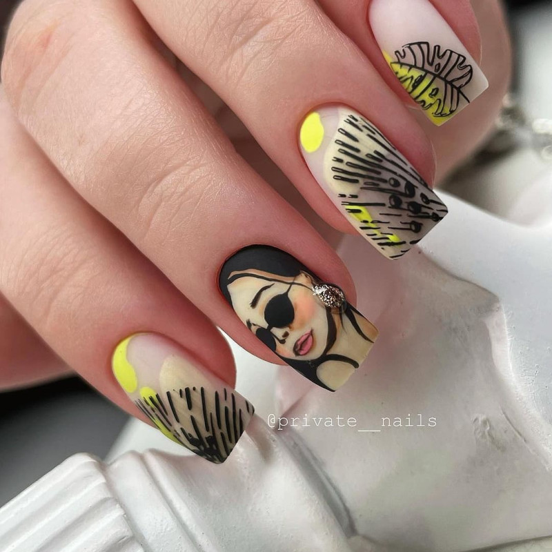 Трендовым прорывом 2023 года стали надписи и портретные изображения на ногтях, а именно лица девушек или глаза, выполненные яркими красками.