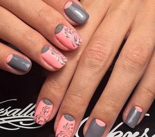 При этом маникюр с узором может быть как на всех ногтях, так и только на одном или нескольких ноготках, остальные ногти могут быть покрыты однотонным лаком или же быть украшены французским маникюром, улыбками, омбре, лунным маникюром.