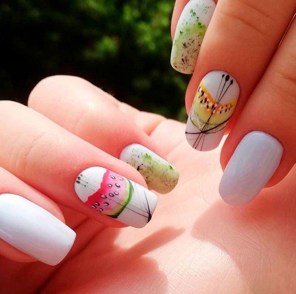 Модный маникюр с фруктами и паутинкой, что скомбинирован с монотонными белыми ноготками, дополнен также легким узором в виде разводов, что поддерживают общую тему цветового решения нейл-арта.