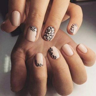Сделать эффектный, нарядный маникюр с узорами-завитками можно, используя черный лак, а создать нежный, ненавязчивый, романтический и очень изящный маникюр с узором помогут завитушки белого или пастельного цвета.