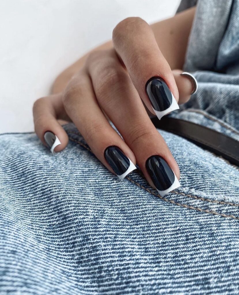 Такой маникюр сейчас очень актуален для поклонниц тёмных оттенков на ногтях.