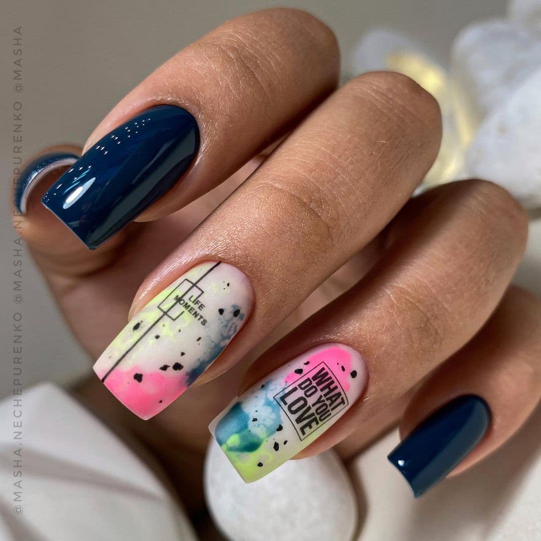 Такой маникюр выбирают самые яркие модницы, которые хотят быть в центре внимания. Дизайн моментально бросается в глаза, это один из самых крутых вариантов на лето, который вошел в новинки сезона. С ним лучше всего сочетаются надписи, геометрия и градиент. Пробуйте экспериментировать и воплощать в реальность свои самые неординарные идеи.