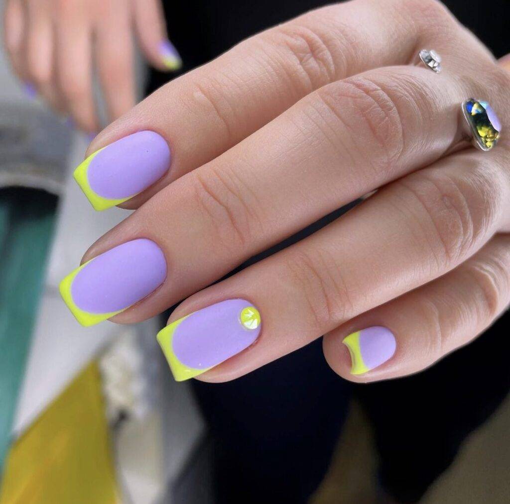 Палитра цветовых решений для выполнения маникюра на короткие ногти не теряет своей актуальности с 2021 года. Это яркая цветная «улыбка» на всех пальцах с контрастным оформлением лунки под любые оттенки.