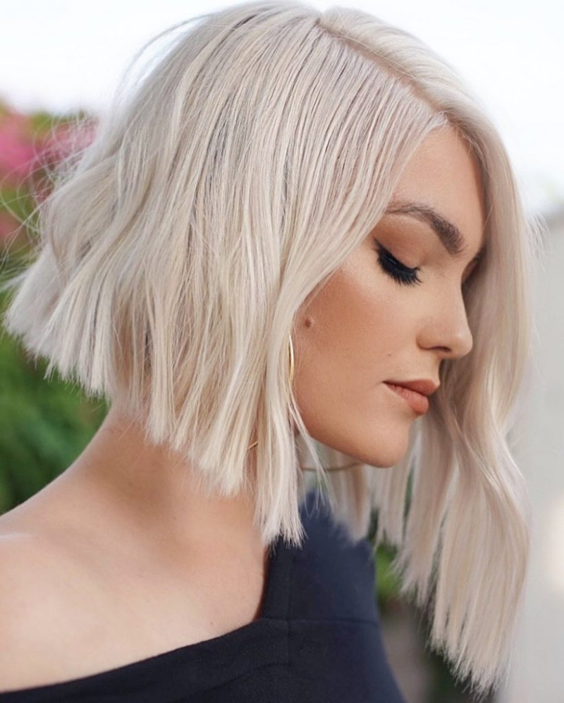 - Удлиненный а-боб с косым побором – более классический и аккуратный вариант боба, что делает его не таким модным, но все еще действительно органичным, если речь идет о круглой форме лица.