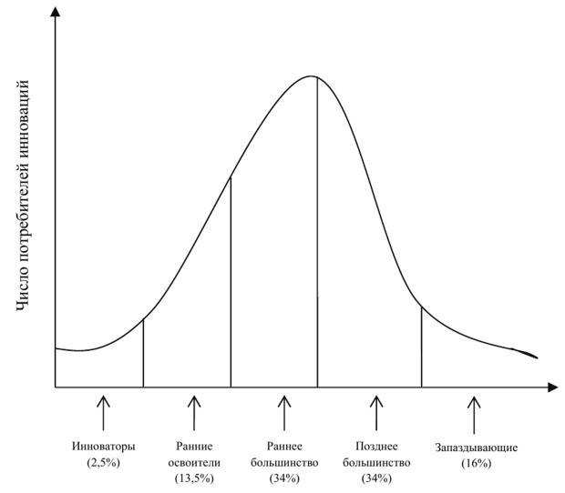 Менее подготовленные группы — те, кому нужно больше времени — смотрят на ранних последователей. Действует референтный принцип: каждая следующая группа смотрит на предыдущую, оценивает ее опыт и, исходя из этого, принимает решение, готова ли она что-то принять. Этот процесс можно увидеть на кривой диффузий инноваций. Обычно так обозначают модель, описывающую распространение инноваций среди сообщества, для которого они предназначены.