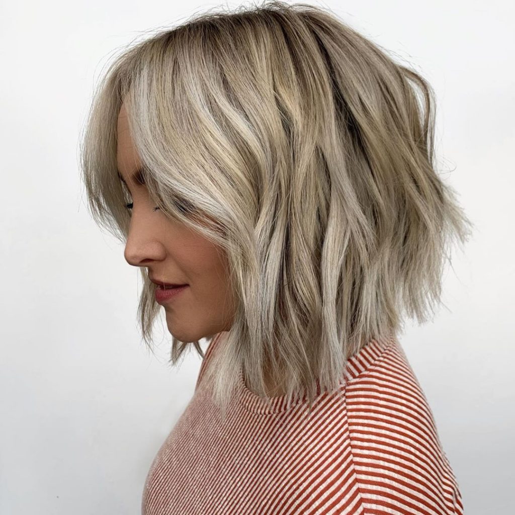 Боб с длиной до подбородка или чуть ниже может создать иллюзию удлинения лица и добавить структуры к округлым чертам. С разнообразием текстурных слоев или асимметричный, может визуально вытянуть лицо.