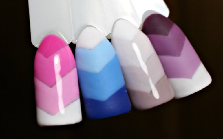 Для нанесения геометрических фигур градиента наряду с гель-лаками используют и обычные лаки. Но техника нанесения разная.