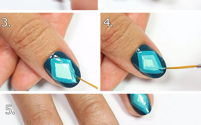 В отличие от предыдущих видов, наносимых губкой, для геометрического понадобится тонкая кисточка и два цвета лака, один из которых белого цвета, другим может быть любой цветной.
