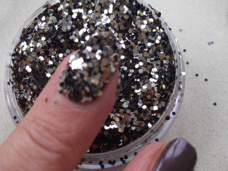 Прекрасный вариант для праздничного дизайна. Кончик ногтя можно заполнить плотными блестками или использовать мелкие частички специальной маникюрной пудры. Втирать их можно аппликатором для теней или пальцем.